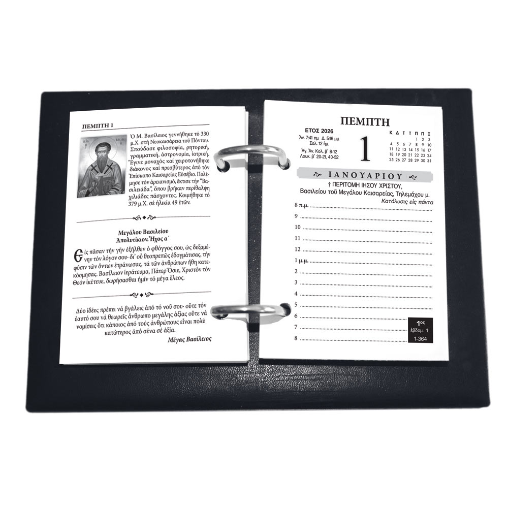 Περιέχει: Εικόνα εορτάζοντος Αγίου κάθε μέρα Συνοπτικά ο βίος του εορτάζοντος Αγίου Απολυτίκιον ή Κοντάκιον Eπιλεγμένα πατερικά αποφθέγματα Αγιογραφικά αναγνώσματα Νηστείες